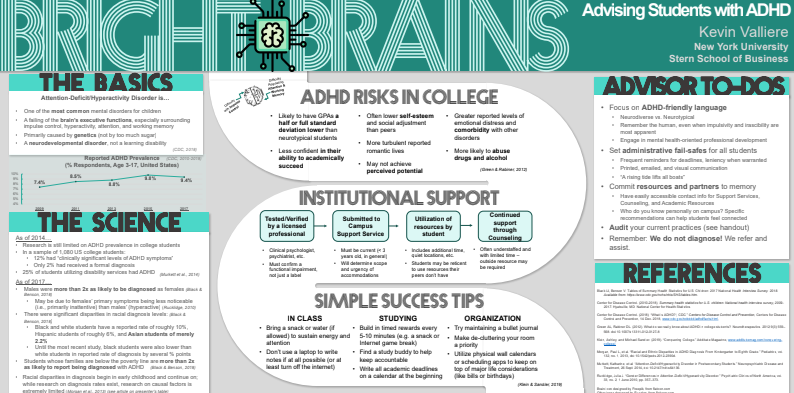 Drawing upon independent research, I created this poster session on advising students with ADHD for NACADA. It focused on the most up-to-date science and terminology surrounding ADHD, and proposed solutions for advisors who wanted to help their students more but weren't sure where to start.
