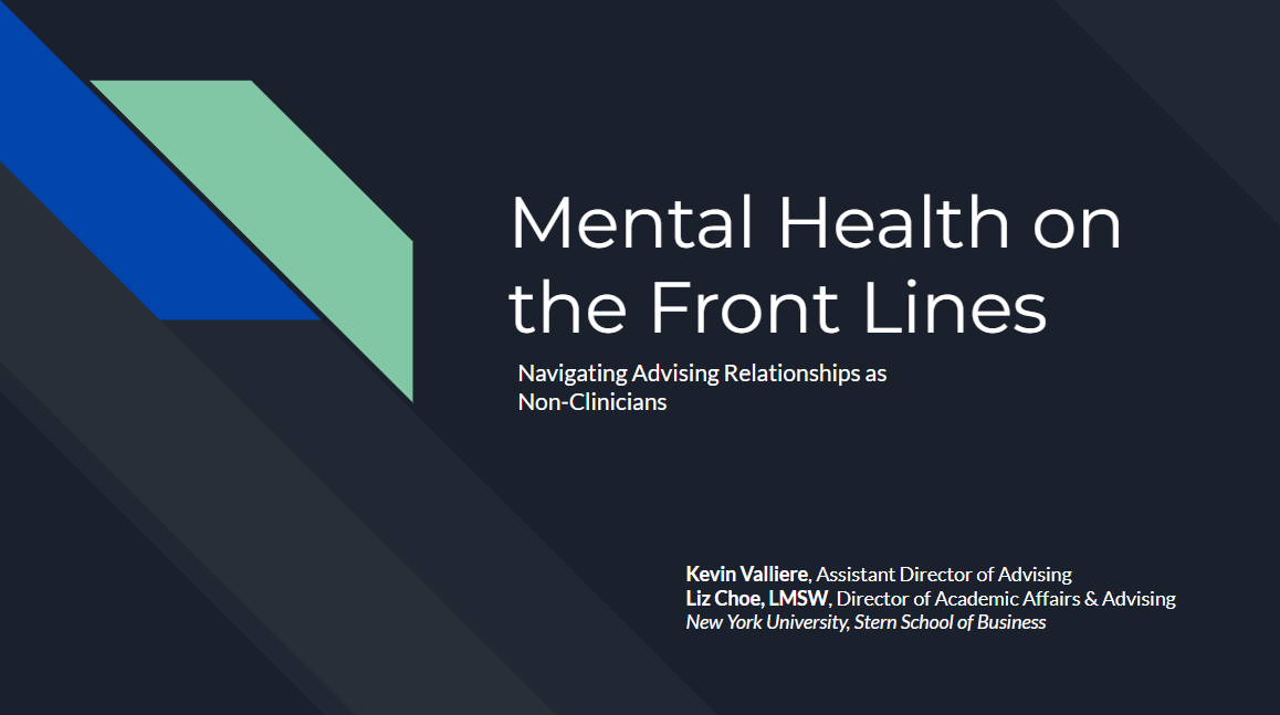 Choe, E. & Valliere, K. (2020). Mental health on the front lines: Navigating advising relationships as non-clinicians. NACADA 2020 Conference (Virtual).