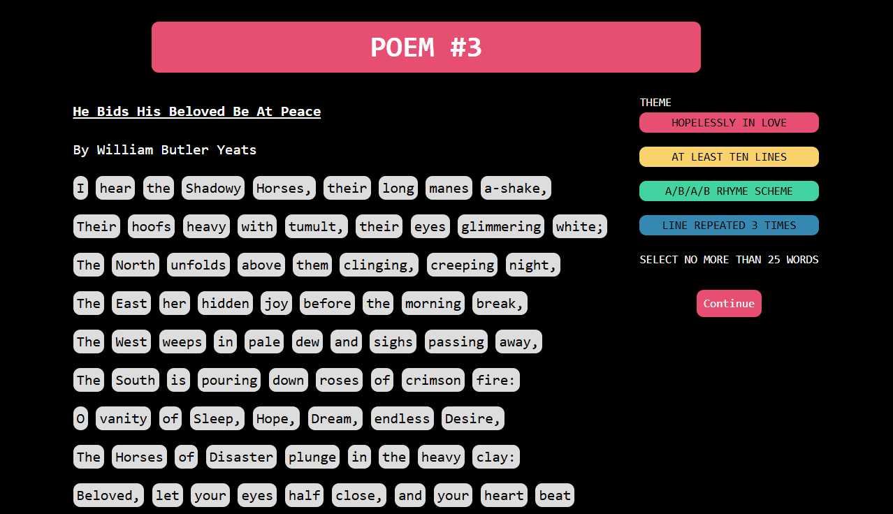 This final class assignment came with a broad mandate to create an educational game. I decided to make an experiential and constructionist poetry game aimed at middle schoolers in which they are tasked to chop up public domain poetry and make their own under randomized conditions in order to be awarded points.