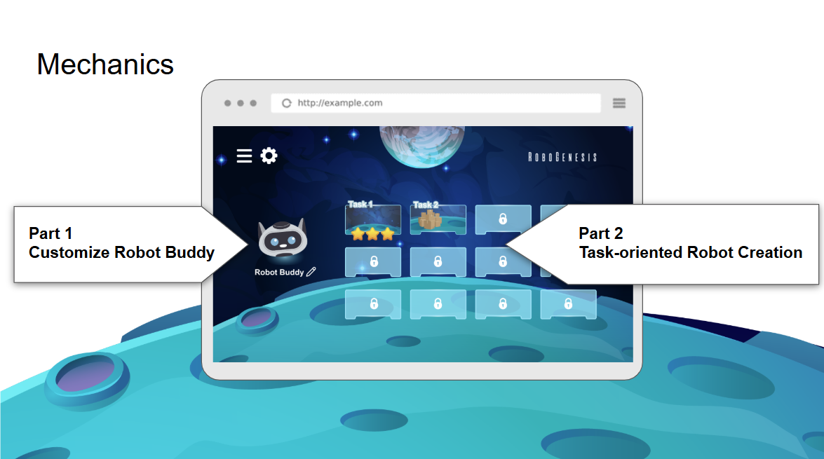 Robogenesis was created as part of a group project around games for learning. In this game, late elementary to early middle school students were tasked with creating robots inside of a sci-fi setting to facilitate the learning of (a) basic robotics and (b) problem-solving skills.